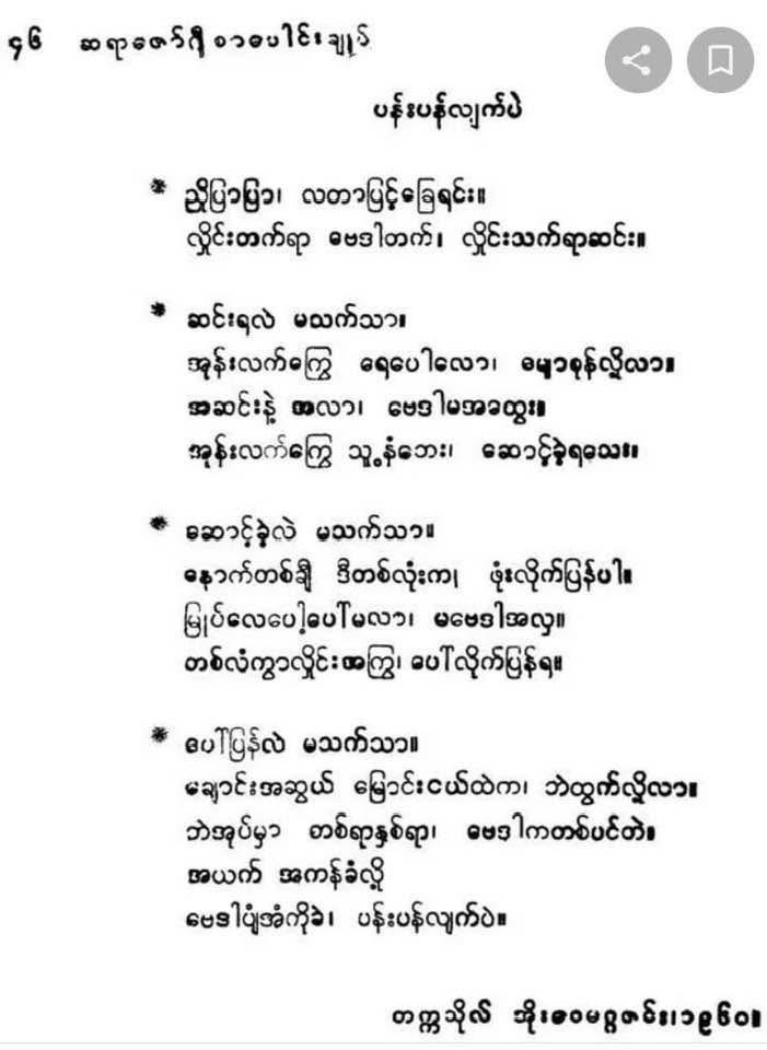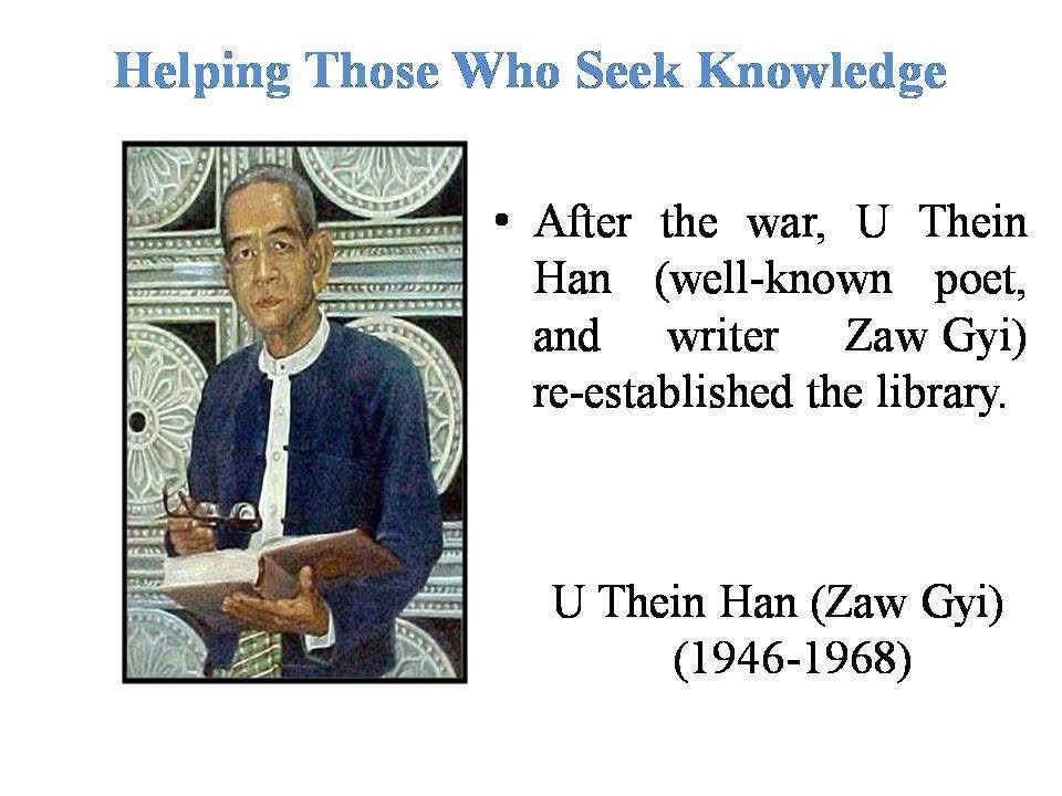 Saya Sein taught Burmese at St. Paul’s High School. His students include U Thet Lwin (Ngwe Hlinne, composer of “Mya Kyun Nyo” song that was sung at the Opening Ceremony of Yar Pyay Ah Kyo)”. The song was first recorded as a “Dat Pya” at Myanmar Ah Than (Burma Broadcasting Service). It was first sung by U Mya Thein and group. It was also sung by the RIT Ah Nu Pyinnya Shins in Singapore (fondly known as the “Pon Chan Chan Group” led by Don Min U Yu Swan).