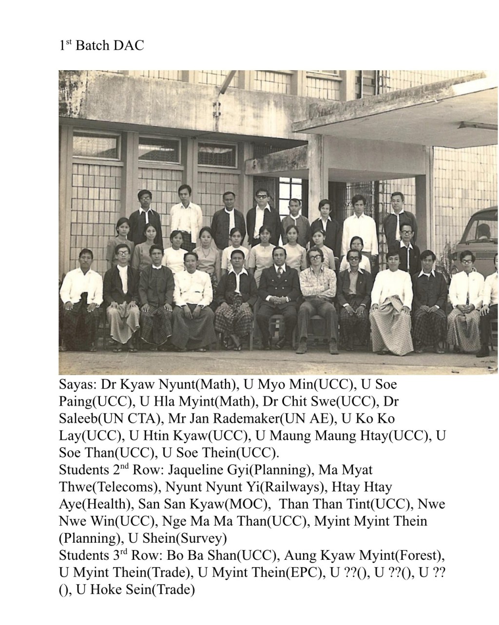 He requested U Soe Paing (RIT Electrical Engineering) to help design and implement the UCC project. He inquired the mother of Saya U Myo Min (Chartered Accountant working as Systems Analyst at IBM UK) if U Myo Min would be interested to come back to Burma and help with the UCC project. U Soe Paing recruited his friend Saya U Ko Ko Lay (PWD, GBNF) to help with the UCC project in general and with the UCC Building Design and Implementation in particular.
