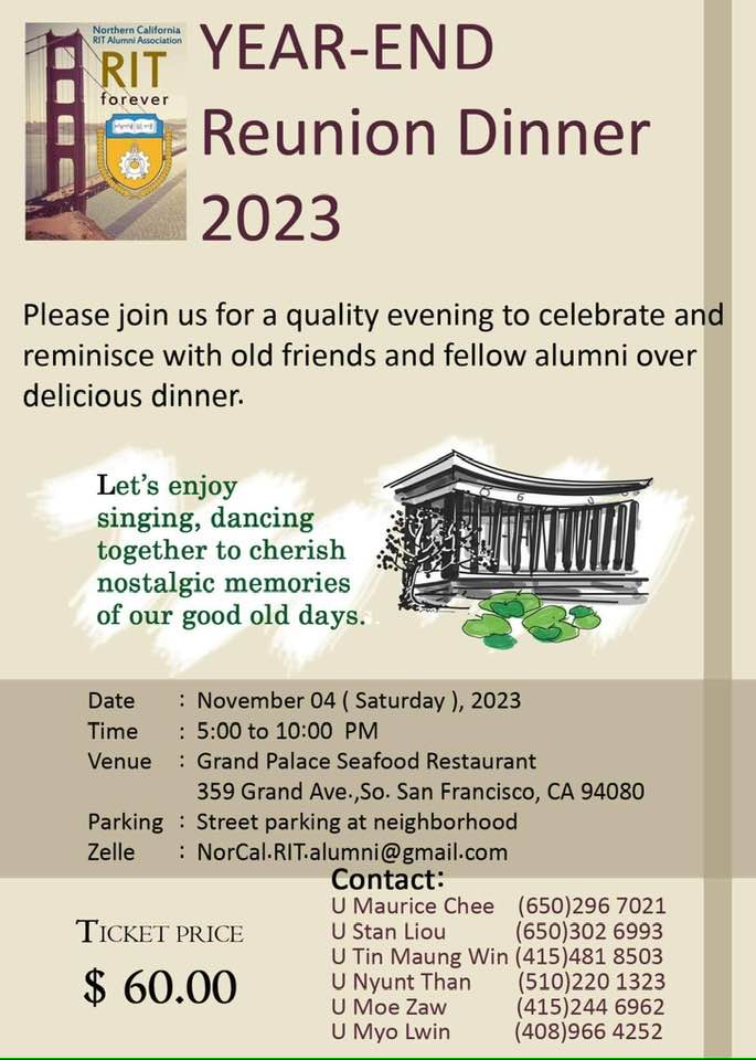 The first ever RIT Grand Reunion and SPZP did not happen out of the blue. One of the first seeds was sown with the founding of Burmese Engineers Association (BEA). The presidents Saya U Htin Paw (EE58), Saya U San Tun (M59) and Saya U KC Chiu (ChE63) — with the able support of Daw Khin Hta Yee (Lily Win, T72) — organized mini-reunions and reunions in the Bay Area. At the welcome party for Saya U Aung Khin, the idea of merging BEA with a younger association BASTS to become BAPS (Burmese American Professional Society) was proposed and overwhelmingly approved.
